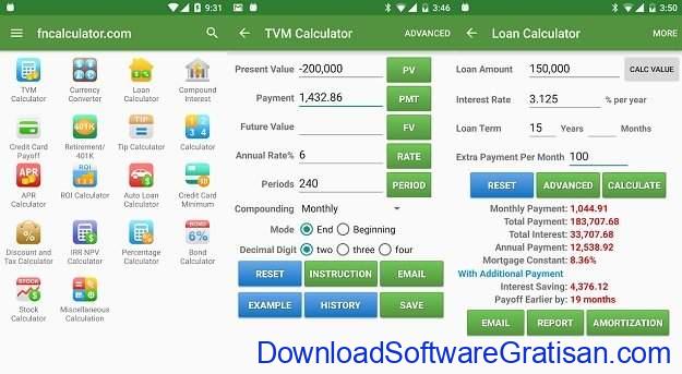 Financial Calculators adalah serangkaian kalkulator yang dapat digunakan dalam membantu memahami keuangan kamu. Financial Calculators memiliki puluhan mode yang dapat membantu kamu dengan cepat dan mudah menghitung apa pun mulai dari dana pensiun sampai pembayaran pinjaman, bunga pinjaman rumah, dan bahkan berapa banyak pajak yang kamu keluarkan setiap kali gajian. Ada beberapa bug yang dilaporkan pada beberapa mode, tetapi sebagian besar bekerja dengan sempurna. Siapa saja yang membutuhkan bantuan dalam menghitung keuangan mereka harus mencoba Financial Calculators.