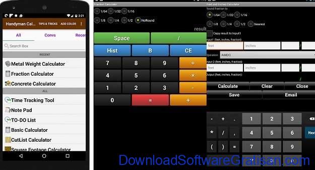 Handyman Calculator adalah salah satu aplikasi kalkulator unik yang memiliki banyak penggunaan. Handyman Calculator memiliki fokus pada berbagai jenis konstruksi dan pertukangan untuk membantu mempermudah proses tersebut. Kamu akan menemukan mode untuk membantu kamu mengetahui berbagai hal termasuk sudut, listrik, konversi unit (kepadatan, suhu, dan banyak lainnya), dan berbagai bahan bangunan. Ada juga kalkulator fraksi yang terintegrasi.