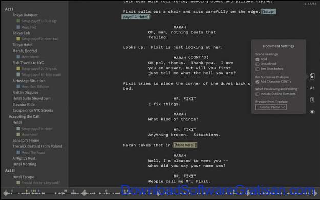 Lebih dari kebanyakan bentuk penulisan lainnya, skenario memiliki konvensi pemformatan yang sangat ketat: semuanya ditulis dalam Courier 12pt pada kertas surat US dengan segala yang ditata dengan cara tertentu. Gagal mematuhi konvensi ini dan kamu hanya akan terlihat seperti amatir. Final Draft memudahkan kamu menulis skenario berikutnya secara profesional.