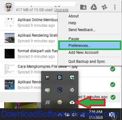 - Alat Backup & Sync akan hidup di system tray komputer kamu selama masih berjalan. Untuk mengakses pengaturannya, cukup klik ikonnya di system tray, klik menu tiga titik di sudut kanan atas, dan pilih “Preferences.”