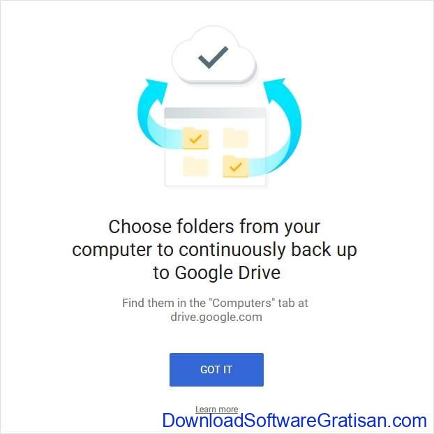 Jika kamu sebelumnya telah menginstal aplikasi Google Drive, Backup & Sync akan secara otomatis login ke Akun Google kamu. Jika tidak, kamu harus login terlebih dahulu. Setelah itu, layar splash cepat akan memberitahu kamu semua tentang aplikasi: mencadangkan barang-barang kamu. Klik “Got it” untuk langsung menggunakan aplikasi.