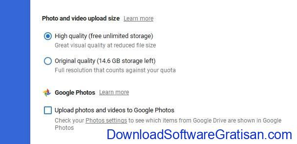 - High Quality, pilihan ini tidak akan memakan ruang apa pun di Drive kamu. pilihan ini menggunakan algoritma kompresi cerdas untuk mengecilkan ukuran gambar tanpa mengurangi kualitas, sama seperti di aplikasi Foto Google pada perangkat Android dan iOS.